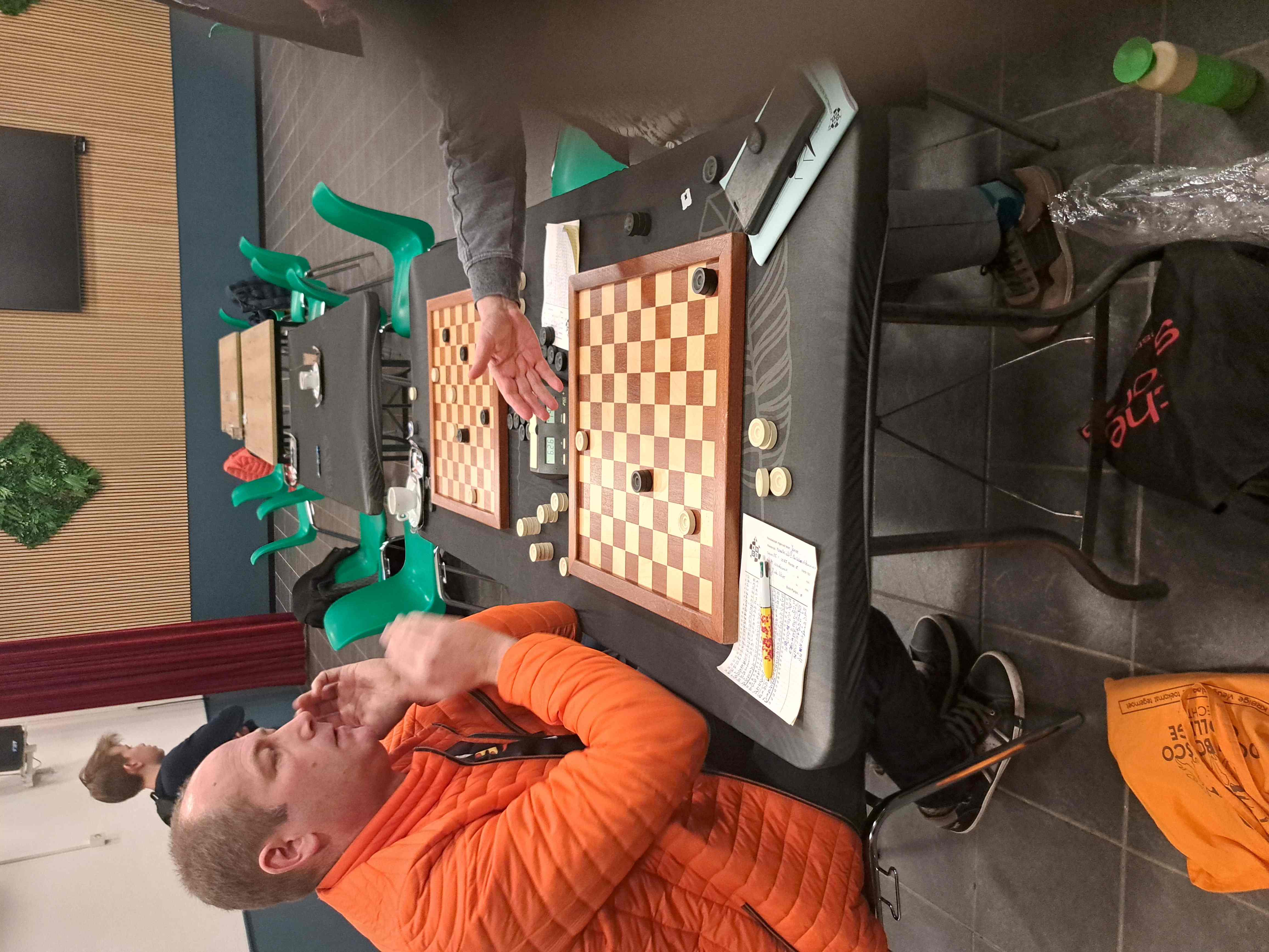 Eric  wist met behulp van de meerslagregel op dam te komen en won (weer) zijn wedstrijd en het was gelijk 3-3.