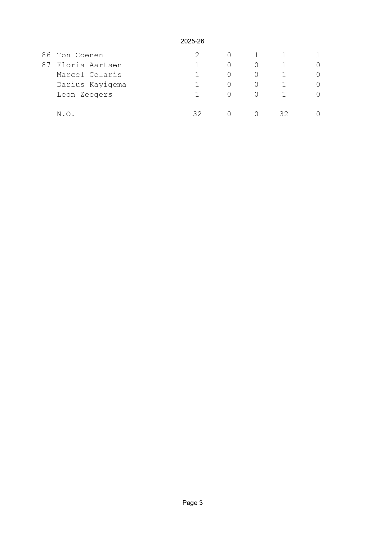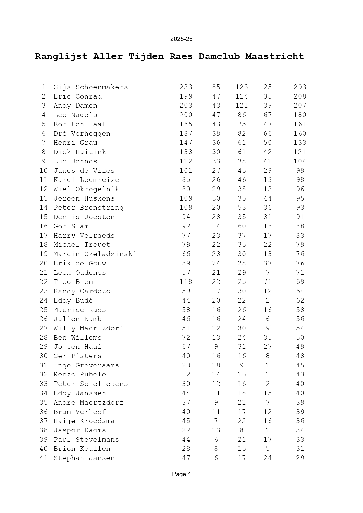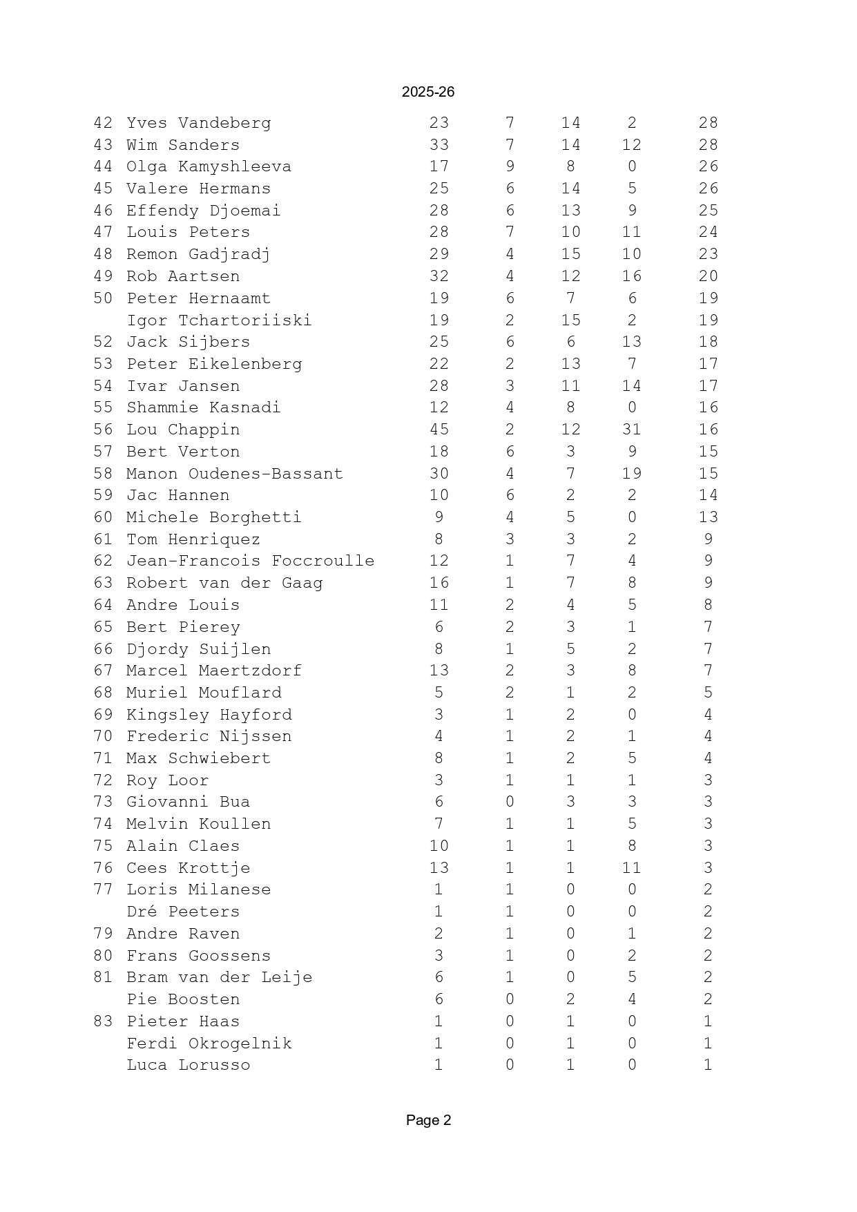 Nu het seizoen 2025-26 ten einde is, is het tijd om weer een nieuwe versie van de ranglijst aller tijden te publiceren. Er waren dit seizoen geen spelers die hun 100e of 200e punt voor de club scoorden (vorig seizoen scoorden Eric en Andy allebei in de voorlaatste ronde hun 200e punt en haalde Luc zijn 100e punt binnen). Wel heeft Janes zijn 100e wedstrijd gespeeld voor de club. Hij staat op dit moment op 99 punten. Aangezien Karel intussen op 98 staat, is er een kans dat we na de eerste ronde van het volgende seizoen twee nieuwe 'centenairs' bij de club hebben!
